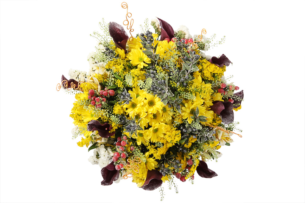 - Хризантема — символизирует долгую жизнь, благосостояние и счастье, потому является универсальным вариантом. За счет множества оттенков и сортов, удачно комбинируется с лилиями и каллами, розами и альстромериями, другими цветами, что позволяет создавать пышные и колоритные композиции.