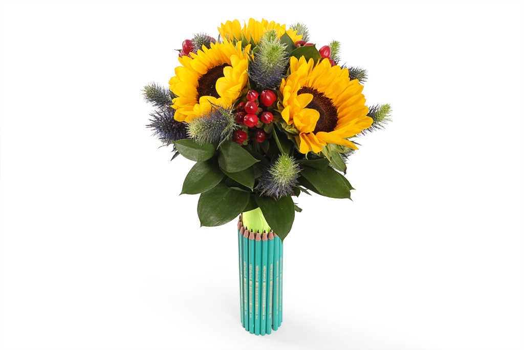 - Первоклассника лучше не нагружать объемными композициями из гладиолусов, высоких роз с шипами, дорогостоящими экзотическими букетами. Куда уместнее заказать цветы на 1 сентября позитивной праздничной цветовой гаммы — герберы, некрупные лилии, гиацинты, мелкие садовые розы, астры, варианты с подсолнухами. Еще одна причина выбрать небольшой букет на 1 сентября первокласснику – на фото с праздничной линейки будет видно именно ребенка, а не охапку цветов.