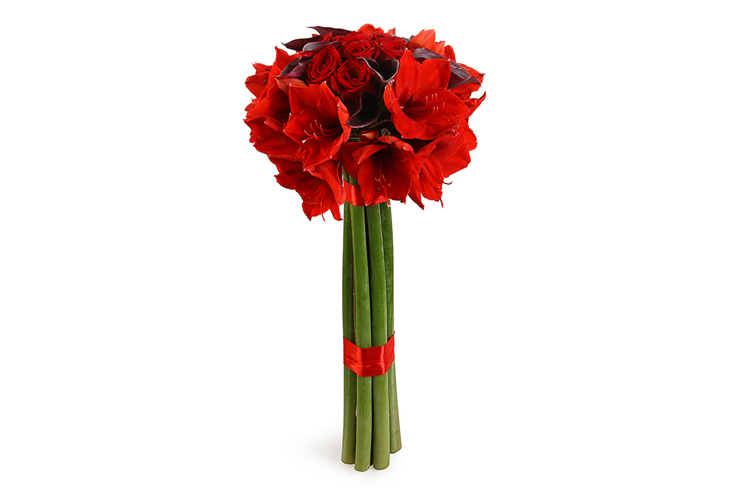 - Варианты с длинными стеблями (на фото) гармонируют с платьями прямого покроя без массивного декора. На фоне изысканных цветов любые детали померкнут.