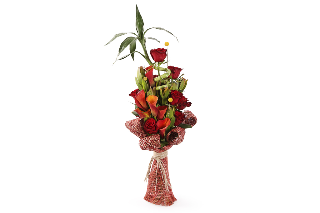 Помимо самих калл, в композиции вплетают розы, орхидеи, гортензии, герберы, пионы, эустому, эвкалипт, ирисы, тюльпаны, маттиолу, аспидистры, фрезии, клематисы, солидаго, лилии, анемоны и другие цветы.