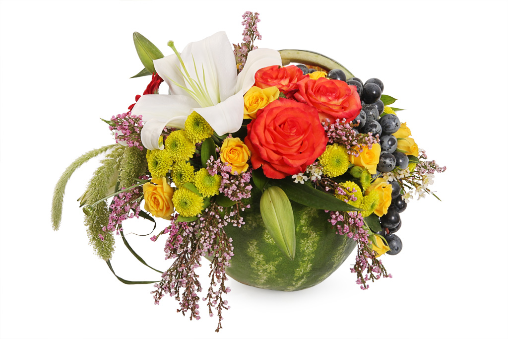 - Украшения для дома – рождественские венки, сезонные букеты в вазе из арбуза с декором в виде винограда.