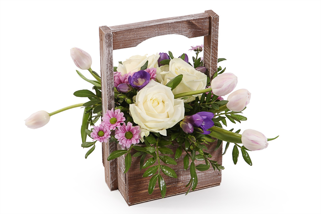 Перед тем, как собрать красивый букет из цветов, приготовьте зеленую флористическую губку (продается в цветочных магазинах), полиэтиленовую пленку, скотч, шляпную или любую подходящую коробку, можно взять небольшой ящик (кашпо). Цветы и растения для подобной композиции можно использовать любые – от роз, пионов, орхидей, гиацинтов, калл до подсолнухов, астр, ромашек, тюльпанов. Секрет такой аранжировки в том, что в кашпо эффектно смотрятся любые виды цветущих растений.