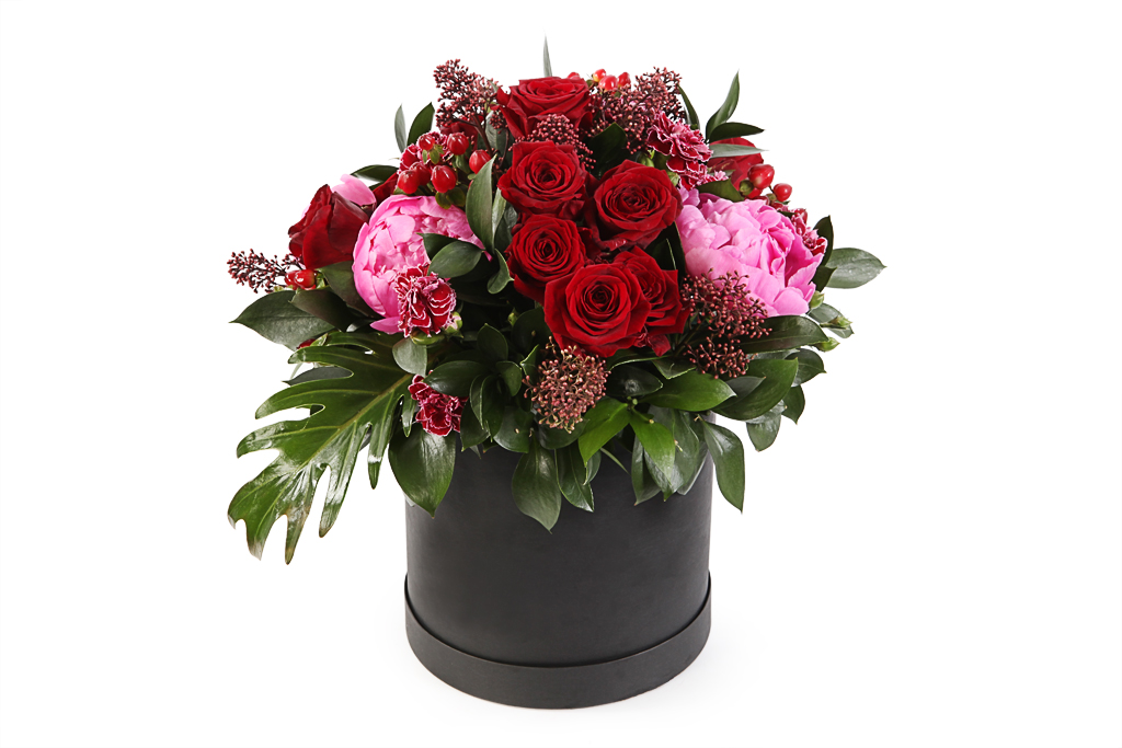 Второй вариант. Еврокомпозиция в шляпной коробке или кашпо – проста в реализации, хорошо получается даже у новичков.