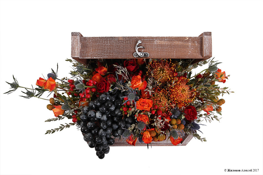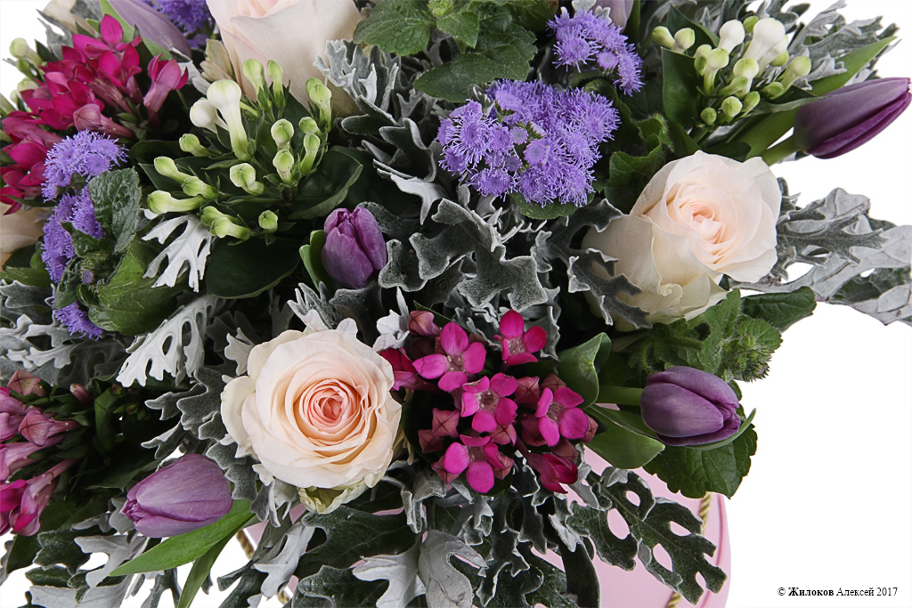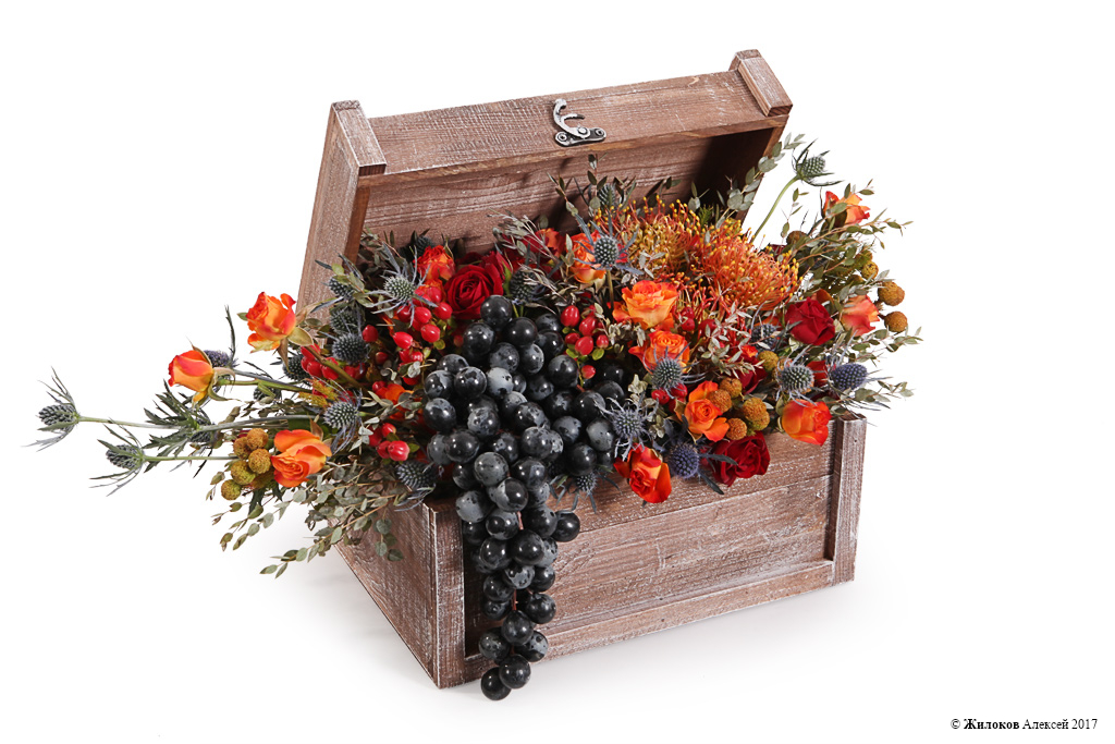 Состав: Роза Дип Перпл - 101Салал - 1 Корзина средняя - 1 |