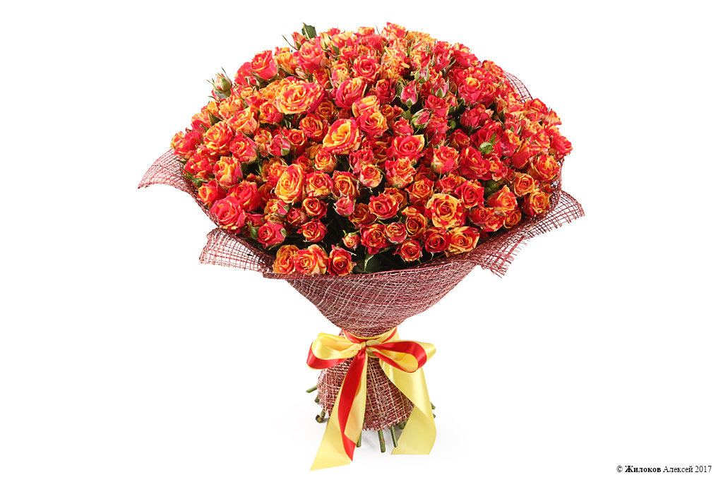 Настоящий фейерверк красоты, взрыв ярких красок - все это о букете из 50 кустовых роз Фаер Флеш. Этот красочный придется как нельзя кстати ярким и зажигательным натурам!