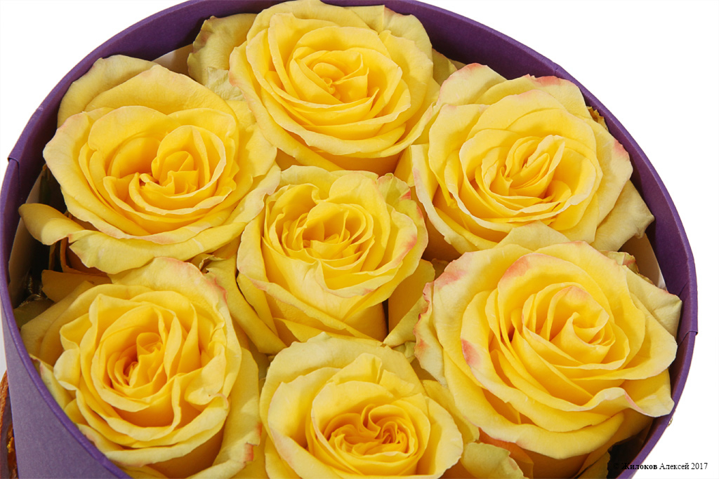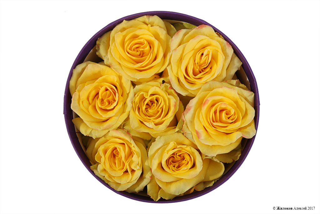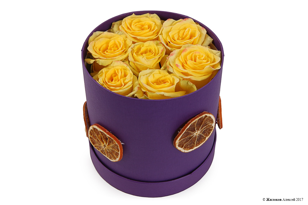 Состав: Роза Хай Еллоу - 7Долька апельсина - 6 Коробка круглая 18х19 (малая) - 1 |