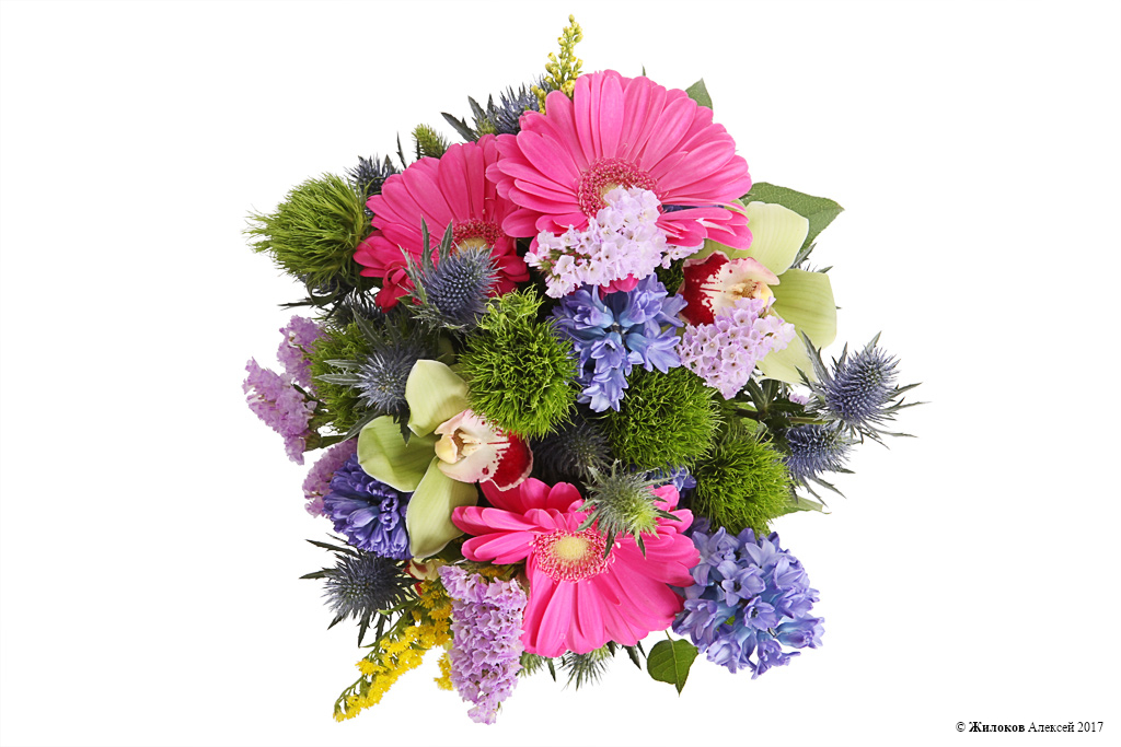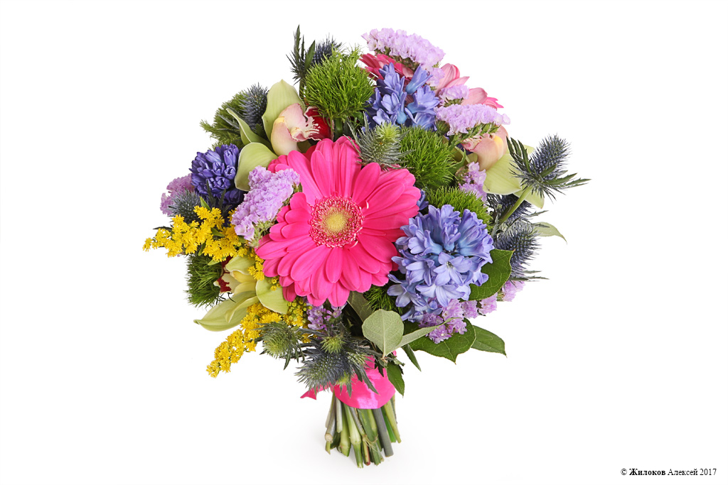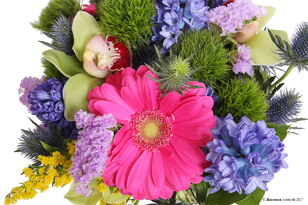 Состав: Гербера - 3Эрингиум - 5 Грин Трикс - 10 Орхидея Цимбидиум - 1 Гиацинт - 5 Статица - 1 Солидаго - 3 Салал - 1 Атласная лента - 1 Удлинители для орхидей - 15 |