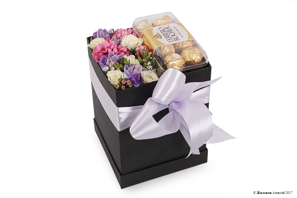 Такой подарок сочетает в себе 2 удовольствия - это эстетическое удовольствие от великолепной цветочной композиции и сладкое удовольствие от вкуснейшего набора шоколадных конфет Ferrero Rocher! Беспроигрышный вариант презента для сладкоежки!