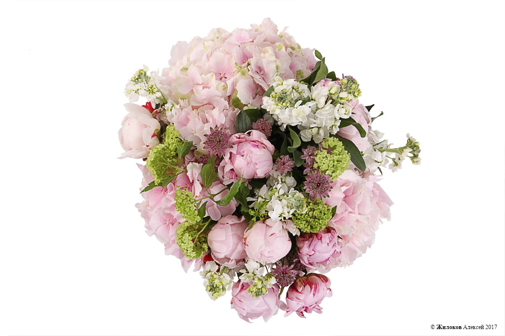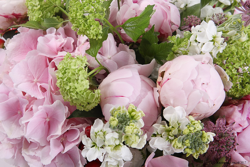 Описание: Букет из розовых пионов и гортензий в окружении нежной зелени всегда придется по душе адресату подарка. А стильная шляпная коробка в качестве упаковки дополнит композицию и сделает ее более современной и эффектной. |