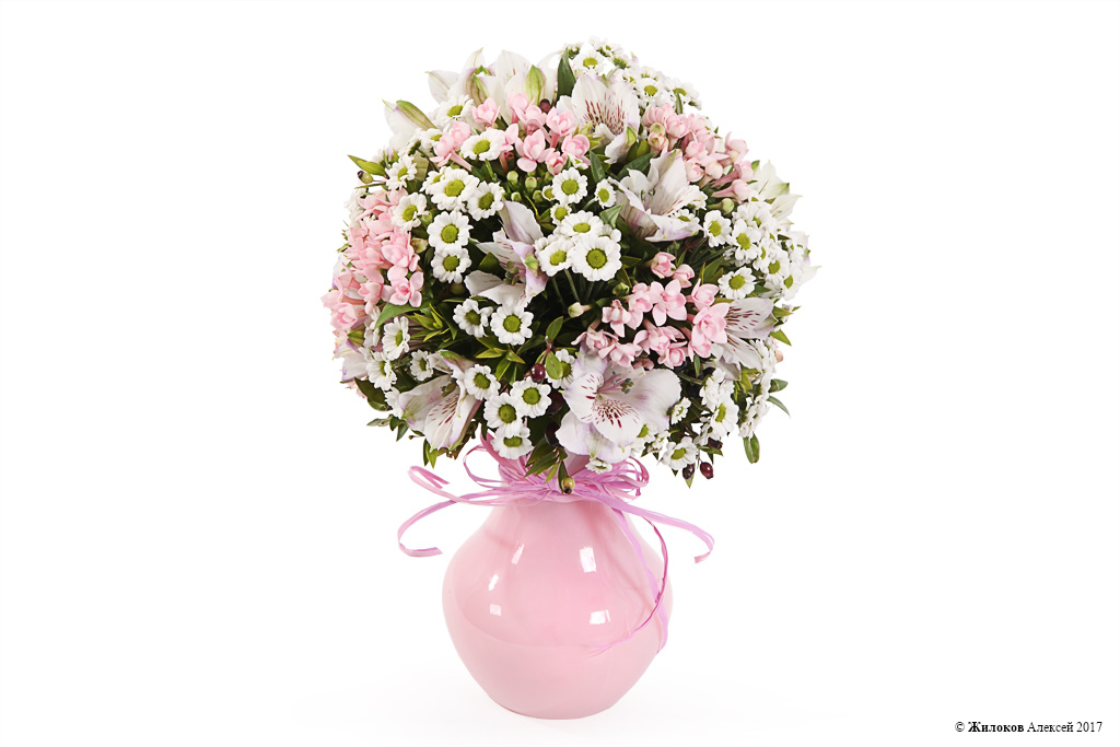 Описание: Прекрасный, нежный и очаровательный букет в бело-розовых тонах призван передать адресату любовь и заботу дарителя. Такой букет в стеклянной вазе станет отличным подарком к любому торжеству и принесет дому атмосферу беззаботного счастья. |