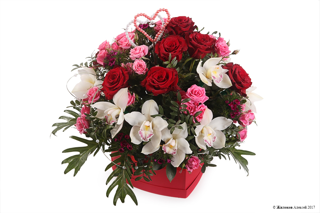 Состав: Роза кустовая (Кения) - 10Орхидея Цимбидиум - 1 Удлинители для орхидей - 15 Лентиско - 1 Филодендрон - 5 Диантус барбатус (гвоздика турецкая) - 1 Коробка "Сердце" 30х25х16 (красное) - 1 Роза Ред Париж - 10 |