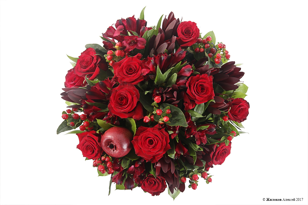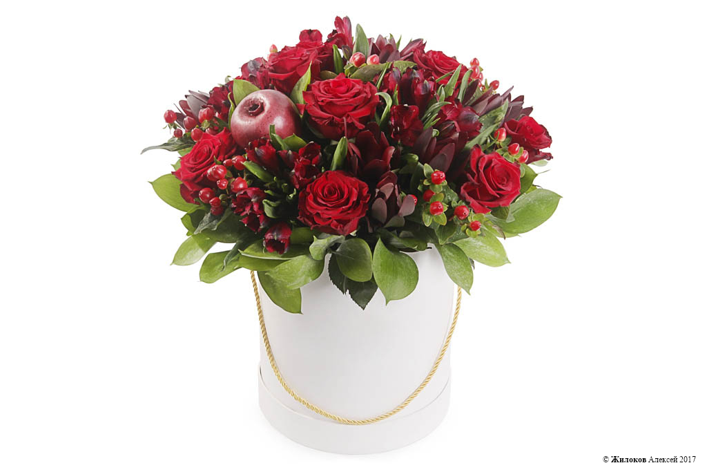 Состав: Роза Ред Париж - 10Альстромерия - 5 Гиперикум - 7 Леукадендрон - 1 Рускус - 9 Декор "Гранат" - 1 Коробка круглая 24х27 (белая) - 1 |