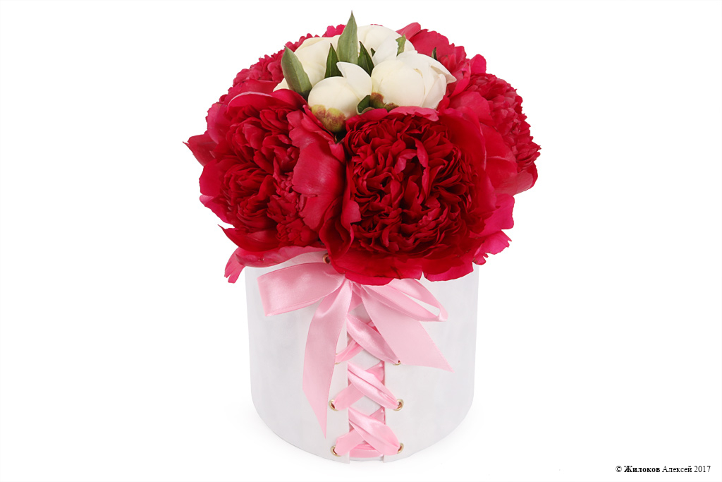 Крупные свежие пионы красного и белого цвета так прекрасны сами по себе, что не нуждаются ни в дополнительной зелени, ни в дополнительном украшении. Круглая белая коробка "Корсет" еще больше усиливает эффектность цветов и делает композицию оригинальной и неповторимой.