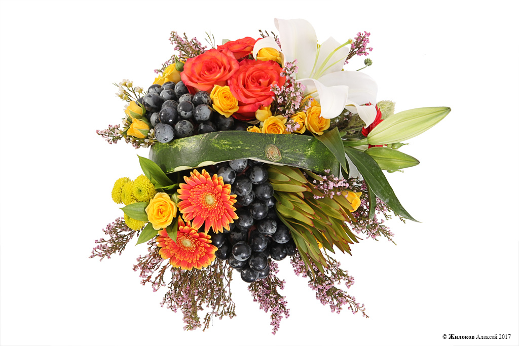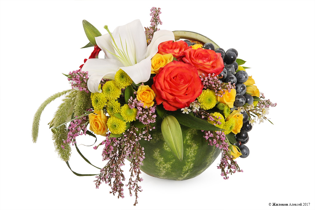 Описание: Необычная и яркая цветочная композиция в настоящем арбузе и с декором в виде винограда - это приятное напоминание о жарком и урожайном лете. А такие составляющие букета как эквадорские оранжевые и желтые розы, белоснежные лилии, леукадендрон унесут мысли получателя в далекий мир тропической экзотики! |