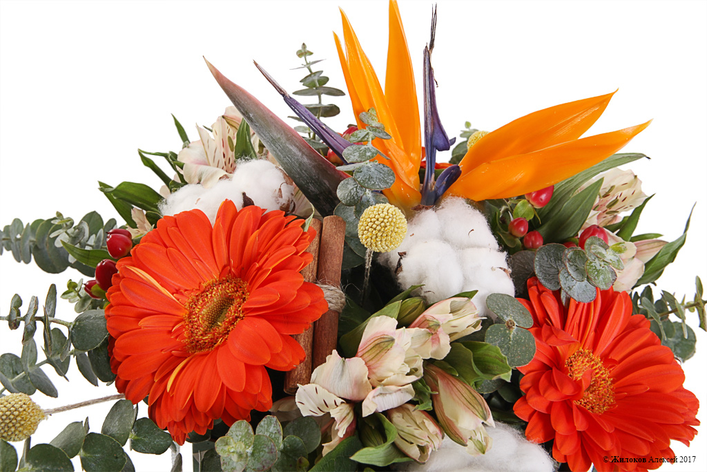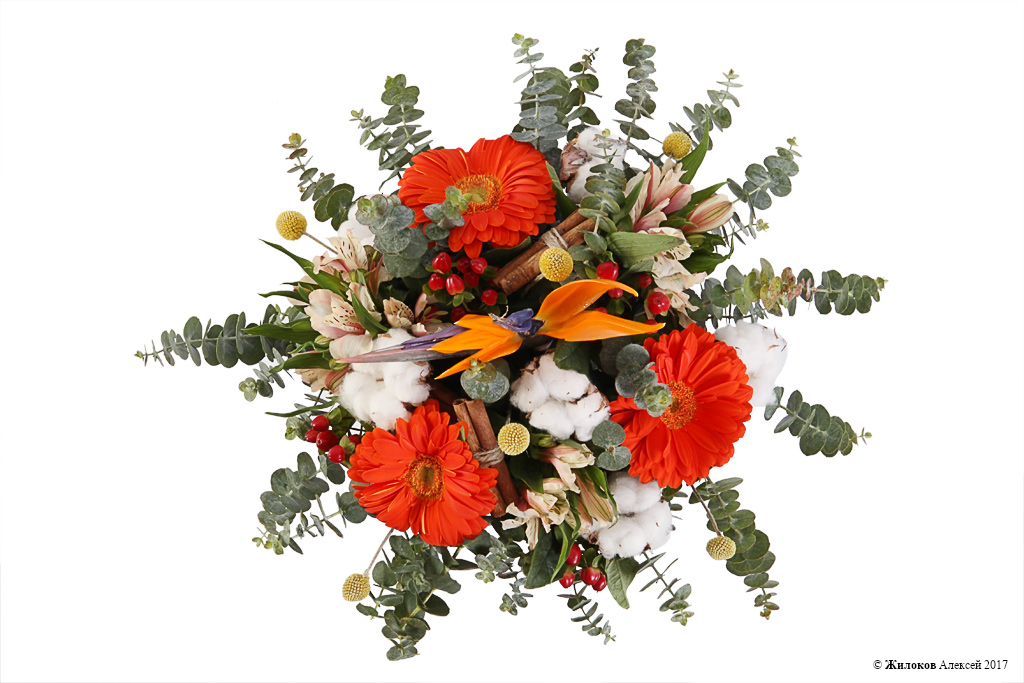 Состав: Гербера - 3Стрелиция - 1 Эвкалипт - 1 Краспедия - 6 Гиперикум - 4 Альстромерия - 3 Хлопок - 1 Корица - 6 Подарочная коробка - 1 |
