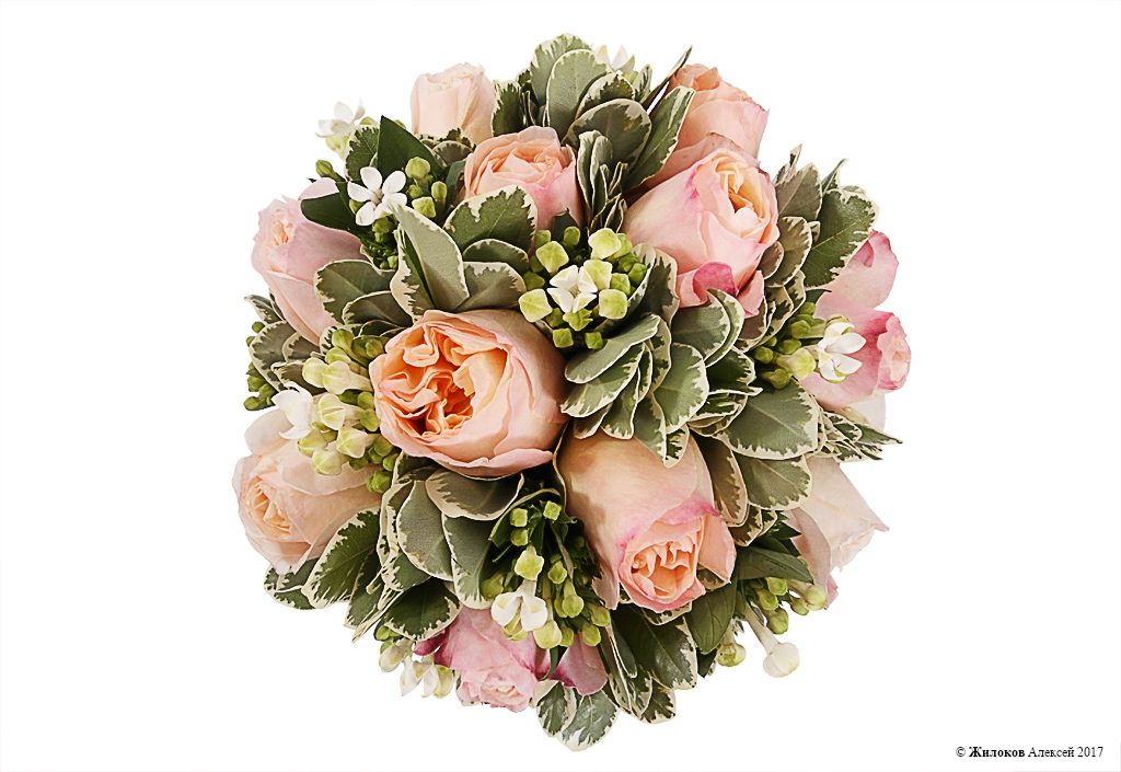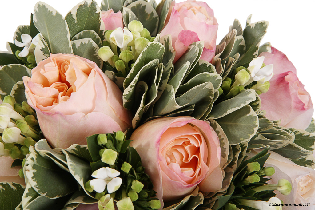 Состав: Роза пионовидная - 11Питоспорум - 5 Бувардия - 10 Коробка круглая 24х27 (голубая) - 1 |