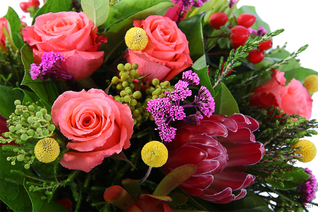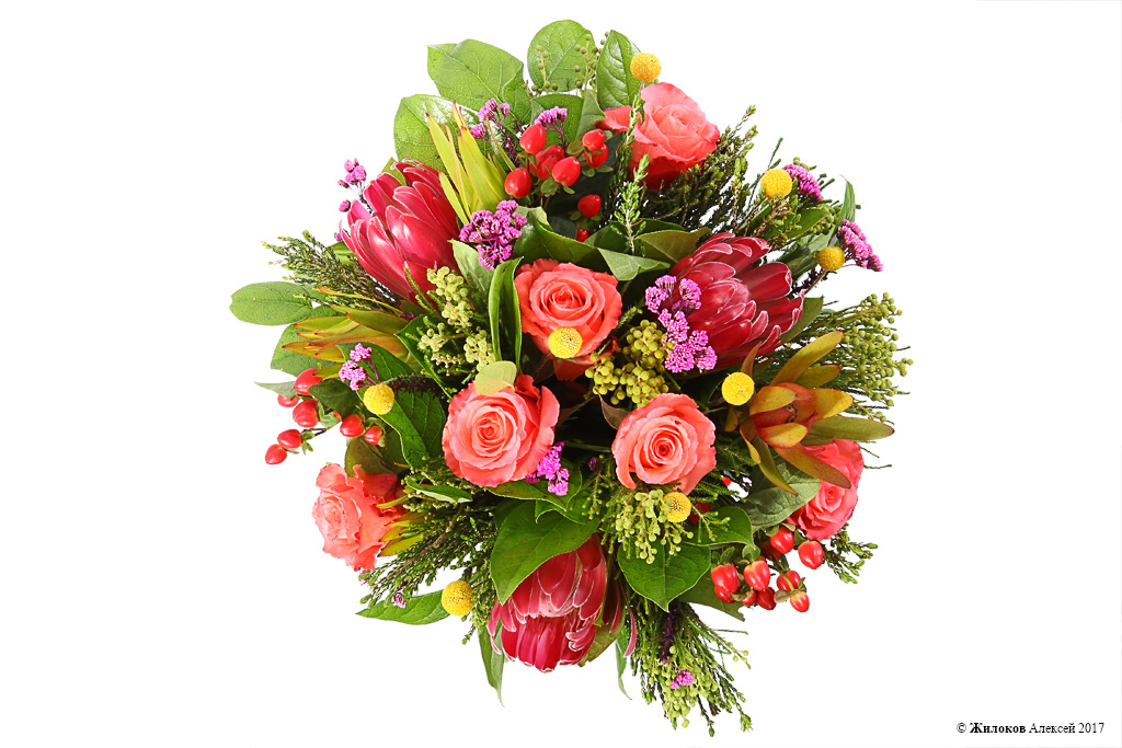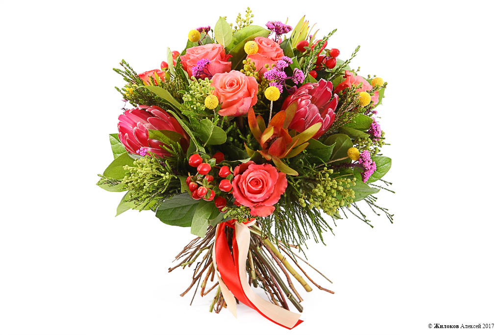 Состав: Роза одноголовая (Эквадор) - 6Три фб (протея+зелень, банч) - 1 Краспедия - 9 Салал - 1 Гиперикум - 3 Атласная лента - 1 |