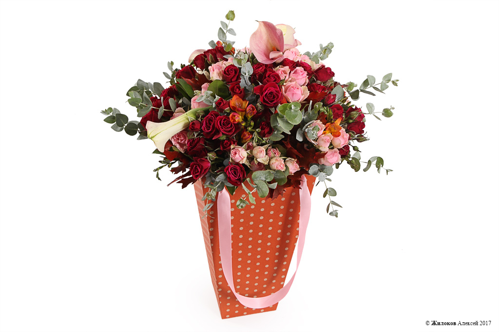 Пышный букет цветов в милой подарочной упаковке - это оригинальный и креативный подарок. Ваше поздравление станет еще более запоминающимся и ярким и не оставит равнодушным ни одного получателя такого подарка!