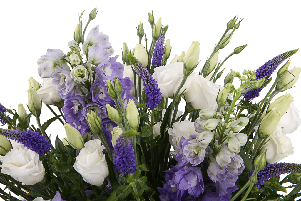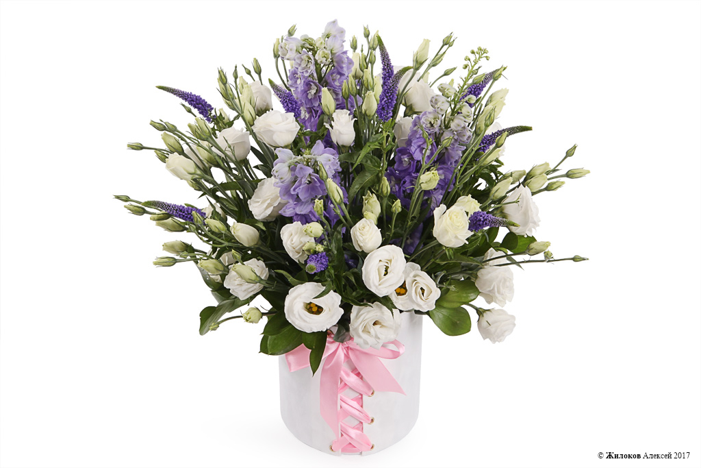 Изысканные и нежные цветы эустомы, напоминающие полураскрытые бутоны роз, гармонично сочетаются с фиолетовыми цветами дельфиниума и вероники, свежей зеленью рускуса. Такая чудесная цветовая гамма композиции поможет Вам передать светлые чувства и теплые поздравления, обворожит своей красотой!