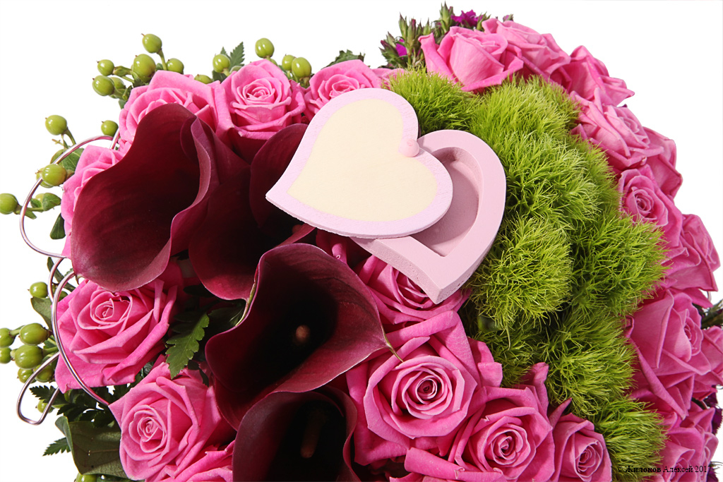 Шикарный букет цветов, центральная роль в котором отведена розовым розам и бордовым каллам. Изящная форма в виде сердца в полной мере передаст адресату все Ваши самые сокровенные чувства. А небольшая деревянная коробочка наверху букета может стать хранилищем для миниатюрного подарка-сюрприза, такого как, например, ювелирное изделие!
