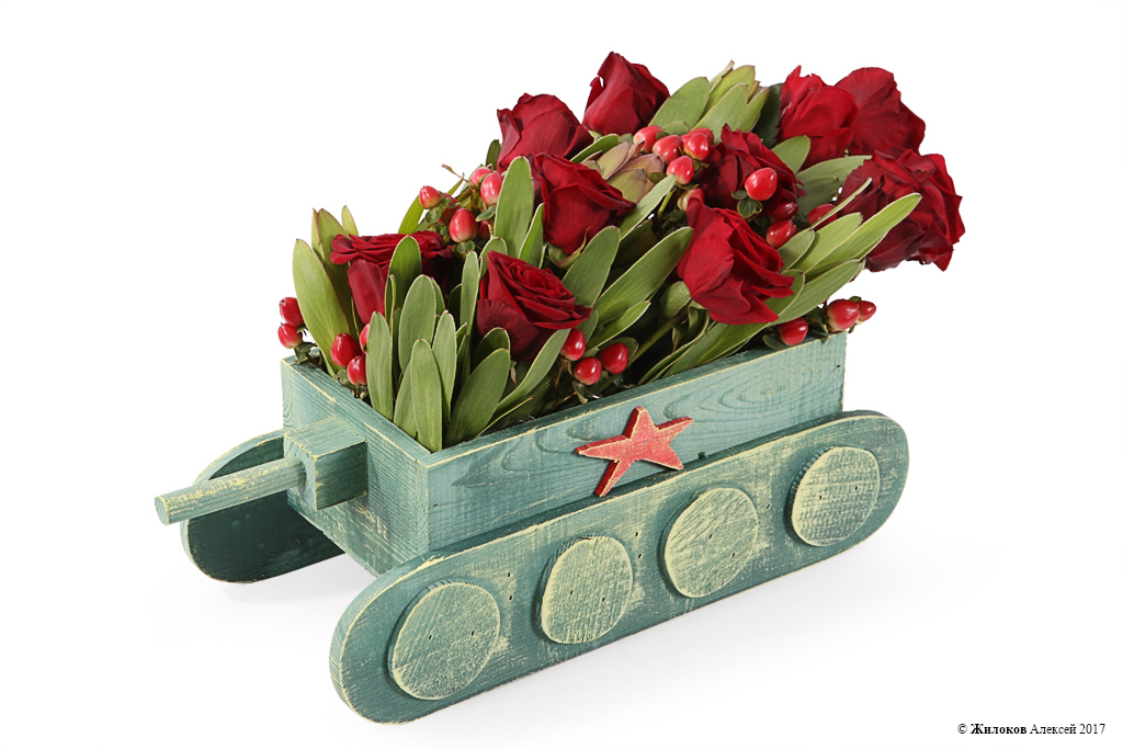 Строгая и лаконичная, но при этом яркая и экстравагантная цветочная композиция, дополненная эксклюзивным кашпо в форме танка с красной звездой, не оставит равнодушным ни одного представителя сильной половины человечества. Такой подарок запомнится получателю надолго и станет оригинальным украшением любого интерьера!