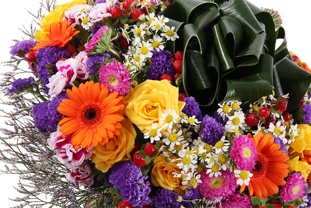 Состав: Статица - 1Каллистефус - 3 Гиперикум - 10 Гвоздика Тессино - 1 Роза кустовая (Кения) - 4 Танацетум Вегмо (ромашка) - 10 Лимониум - 1 Аспидистра - 9 Гербера мини - 7 Атласная лента - 1 |