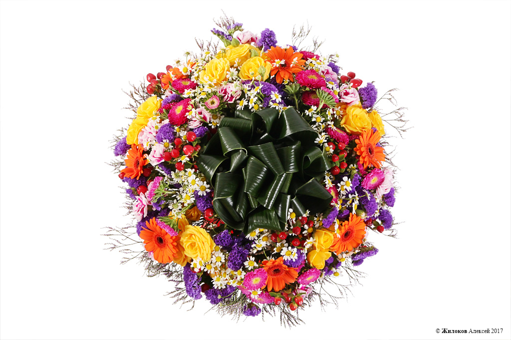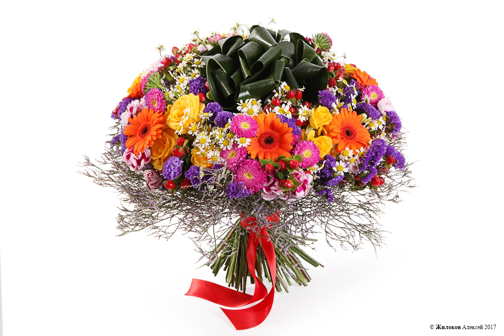 Подарите дорогому человеку частичку цветущего летнего луга, а вместе с ней - прекрасное настроение, солнечное тепло и собственную любовь! Эффектное украшение букеты из темной зелени листьев добавляет простой на первый взгляд композиции изысканности и шарма.