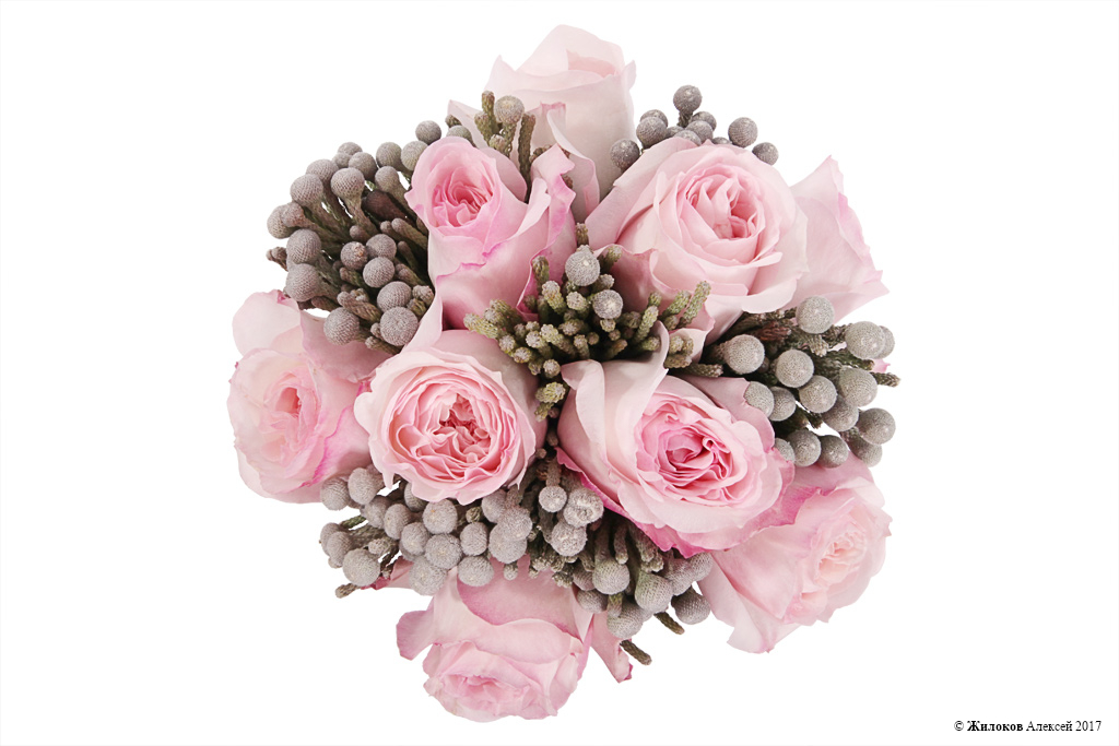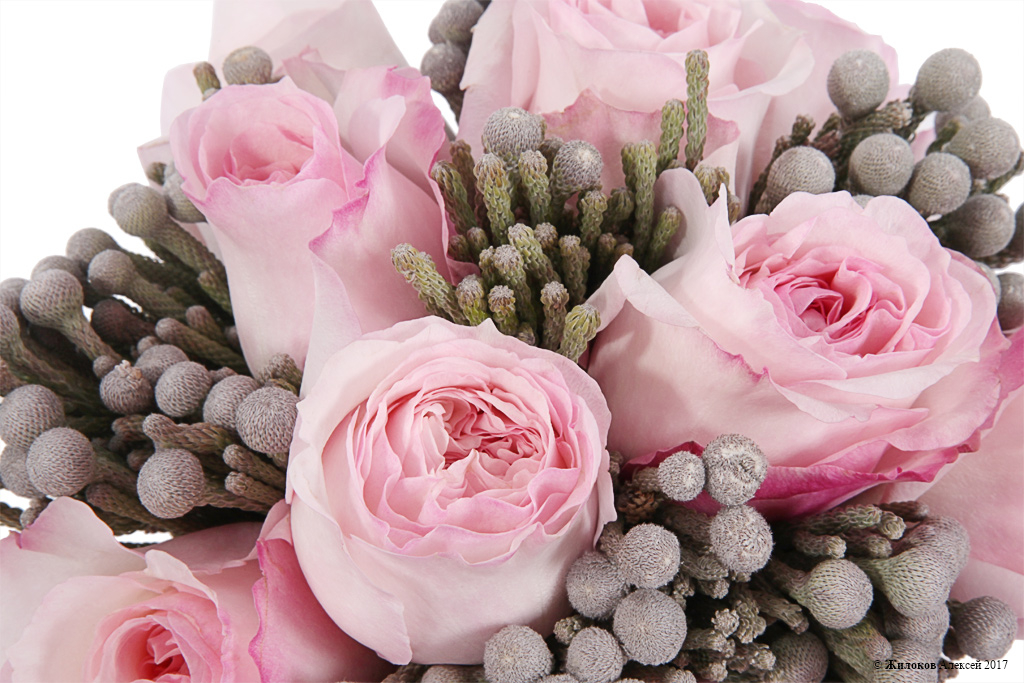 Невероятное сочетание розовых пионовидных роз и серебряных шариков брунии поражает своей оригинальной красотой и необычным контрастом. Такой подарок станет прекрасным вариантом поздравления для креативных особ и тех, кто не боится экспериментов!