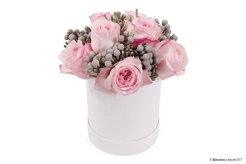 Состав: Роза пионовидная - 9Сильвер бруния - 1 Коробка круглая 14х15 (белая) - 1 |
