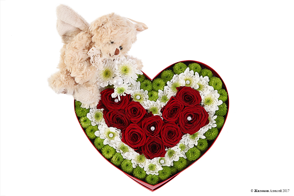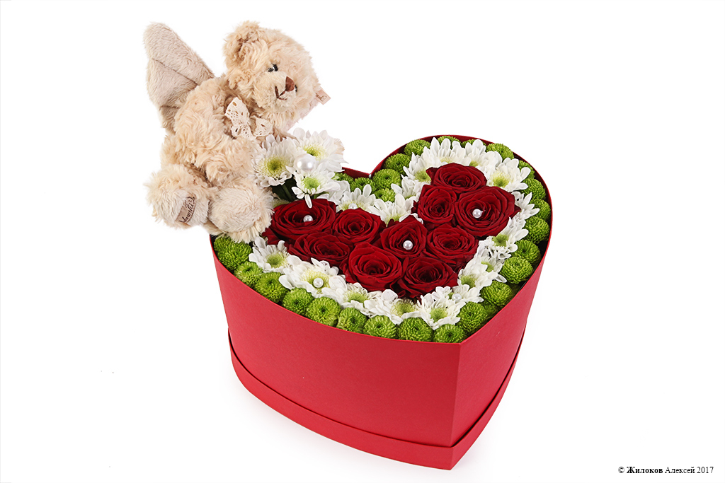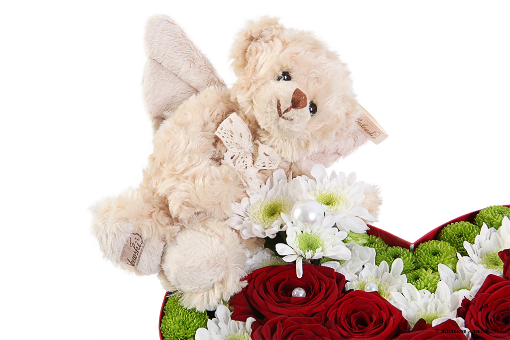 Описание: Цветочная композиция из алых роз и хризантем – это чудесный презент, который поможет передать самые главные слова «Я тебя люблю». А плюшевый медвежонок с крылышками станет маленьким ангелом-хранителем, уберегающим от всего плохого Вашу вторую половинку. |