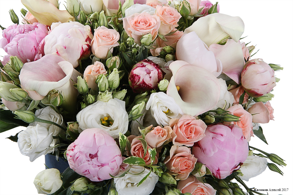 Состав: Роза кустовая (Кения) - 7Пион - 10 Калла - 10 Эустома - 1 Питоспорум - 5 Коробка круглая 24х27 (большая) - 1 |