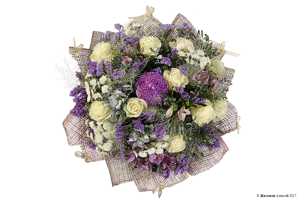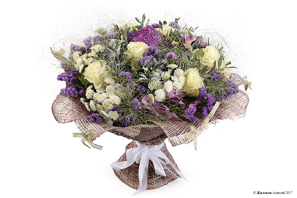 Описание: Зимний букет из классических белых роз и альстромерий словно окружен облаком пушистого снега из хризантем, статицы и тончайших стебельков паникума. Очаровательный, нежный и оригинальный подарок, приуроченный к зимним праздникам!