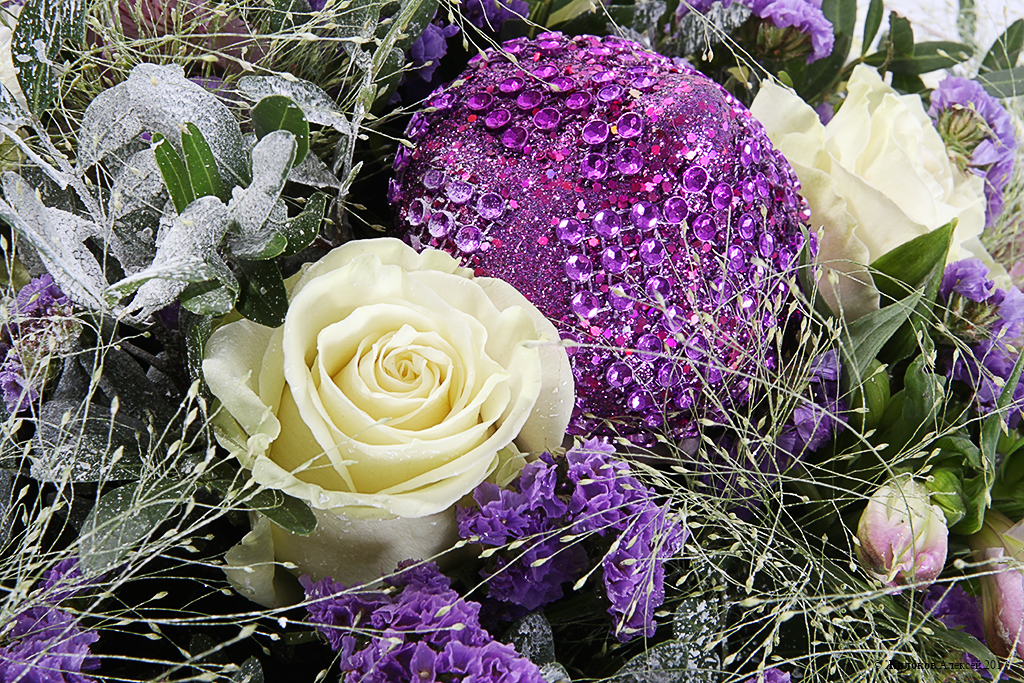 Состав: Статица - 1Лентиско - 2 Паникум - 11 Альстромерия - 5 Хризантема Спрей Сталлион - 5 Роза одноголовая (Эквадор) - 10 Шар новогодний - 1 Атласная лента - 1 |