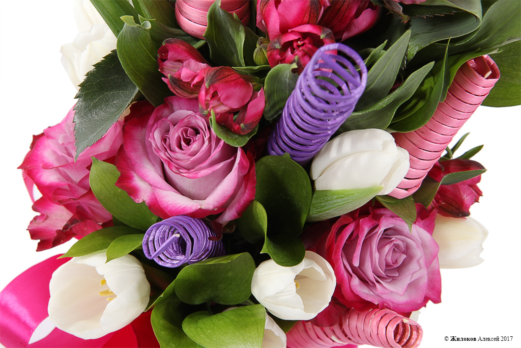 Состав: Роза одноголовая (Эквадор) - 10Тюльпан - 19 Ветка декоративная curly - 11 Альстромерия - 5 Рускус - 10 Атласная лента - 1 |