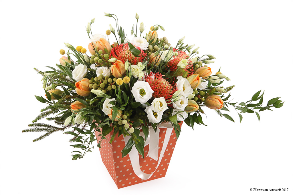 Описание: Цветы в подарок – это беспроигрышный вариант без слов рассказать адресату о Ваше любви и нежности. Белоснежные эустомы и весенние тюльпаны в стильном бумажном пакете вместо обычной упаковки сделают любой день ярче! |