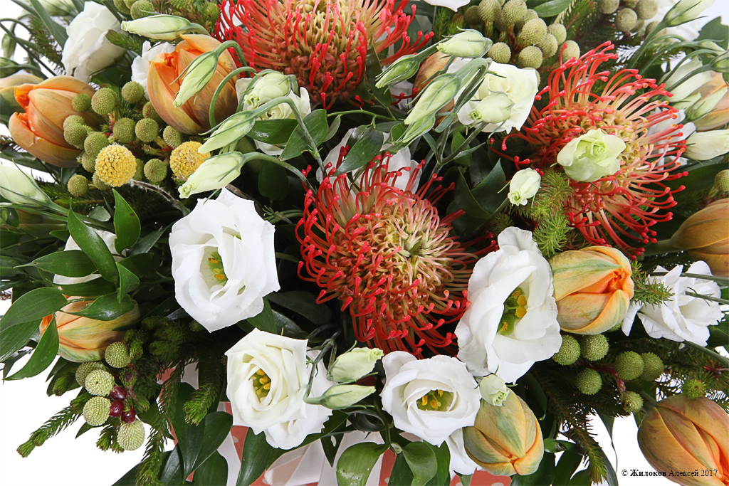 Состав: Рускус Акулеатус - 1Эустома - 1 Берзелия - 1 Краспедия - 10 Леукоспермум - 3 Тюльпан - 19 Коробка-конус (малая) - 1 |