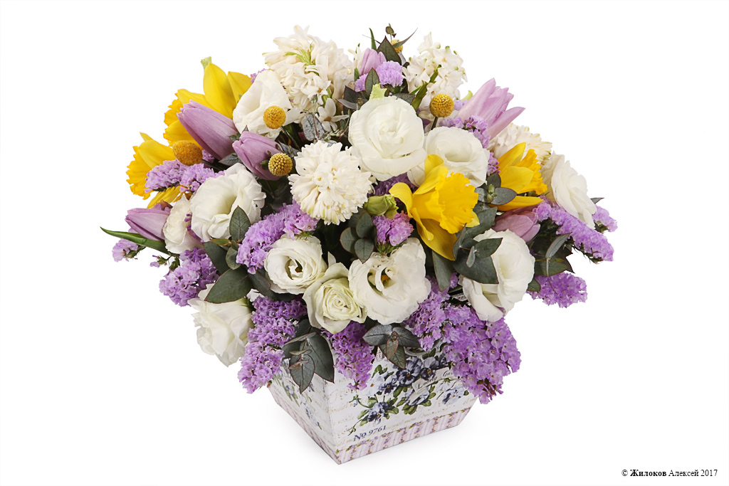 Состав: Нарцисс (деффодайл) - 7Тюльпан - 9 Гиацинт - 5 Эустома - 1 Статица - 1 Краспедия - 7 Эвкалипт - 1 Кашпо 17х17х15 - 1 |