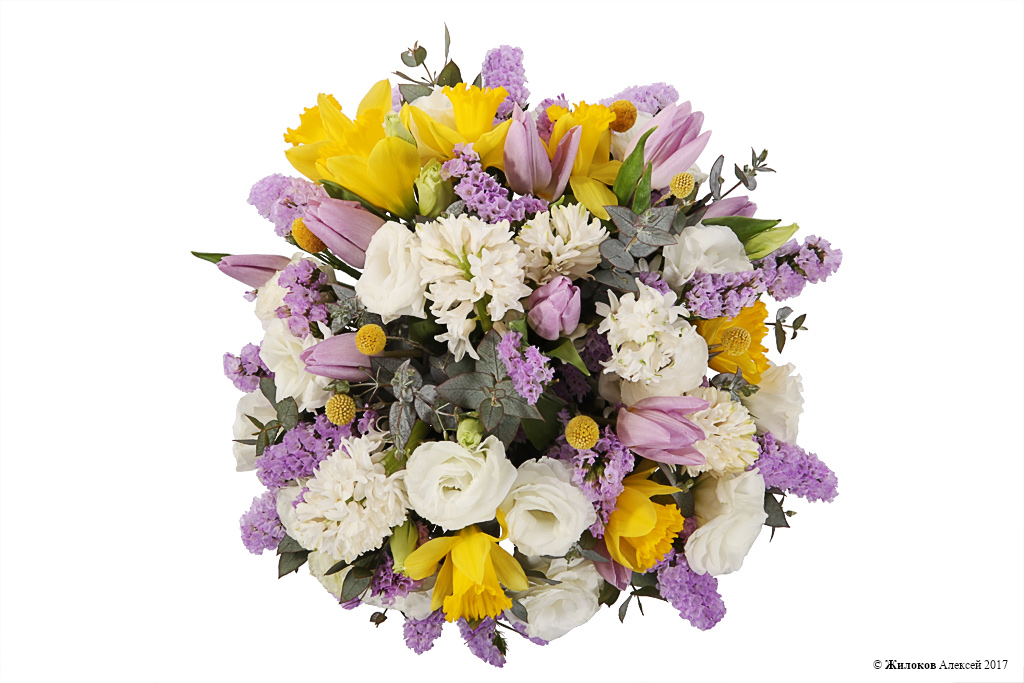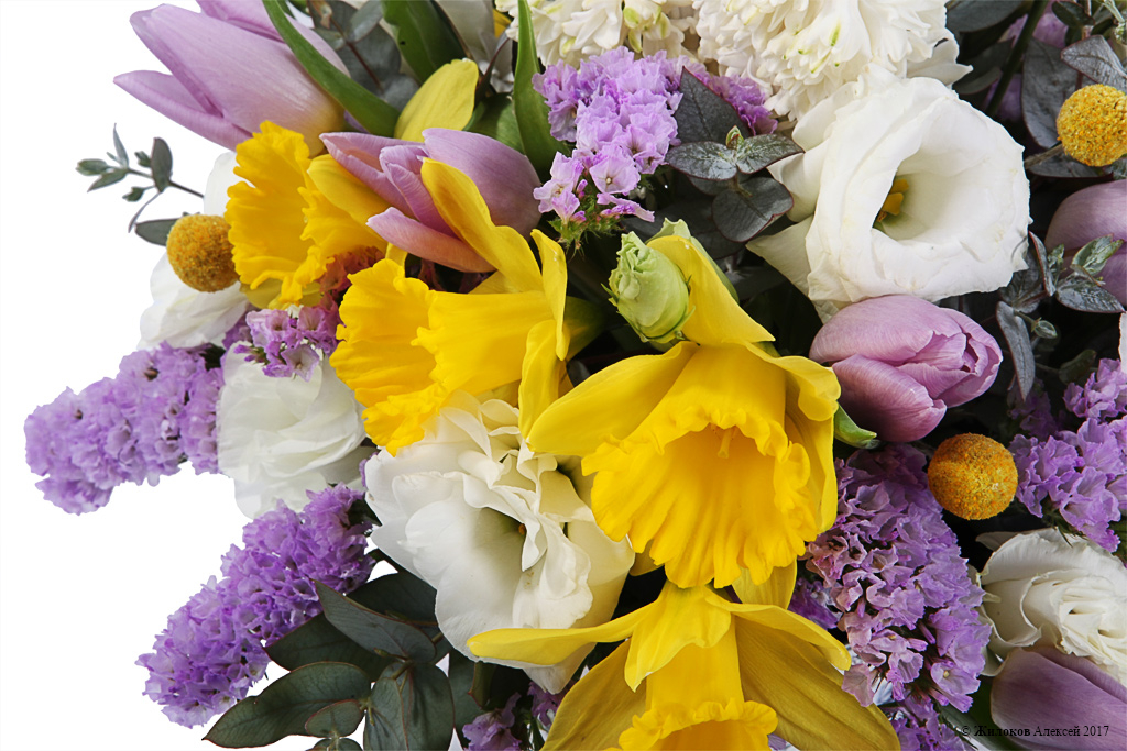 Описание: Невероятная живая цветовая гамма букета наполняет его загадочностью и таинственностью. Фиолетовая статица притягивает взгляд и придает всей композиции символичности, ведь фиолетовый цвет - это цвет преданности и доверия. Желтые нарциссы выступают символом ласкового солнца и теплых чувств. А присутствие белой эустомы делает букет более утонченным. Такой подарок очень нравится творческим натурам и станет лучшим выбором для начала весны! |