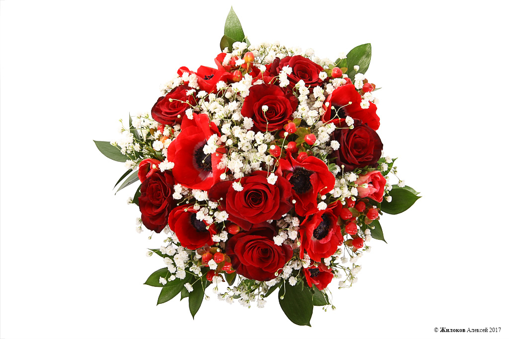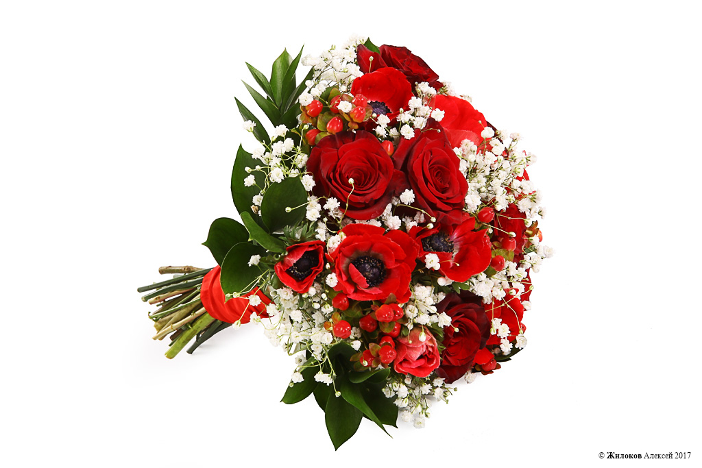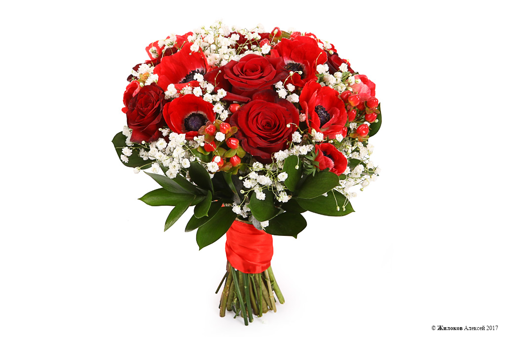 Описание: Алые роза и анемоны, утопающие, как молодожены в любви, в пушистом облаке из воздушной гипсофилы. С таким букетом невеста будет чувствовать себя настоящей принцессой в ожидании чуда!