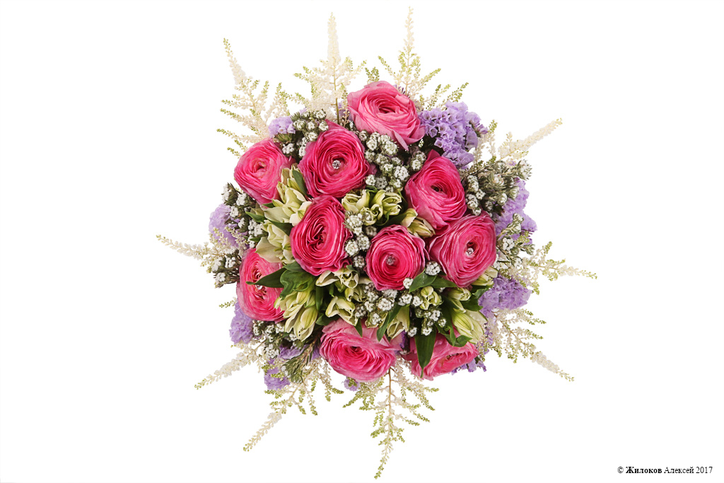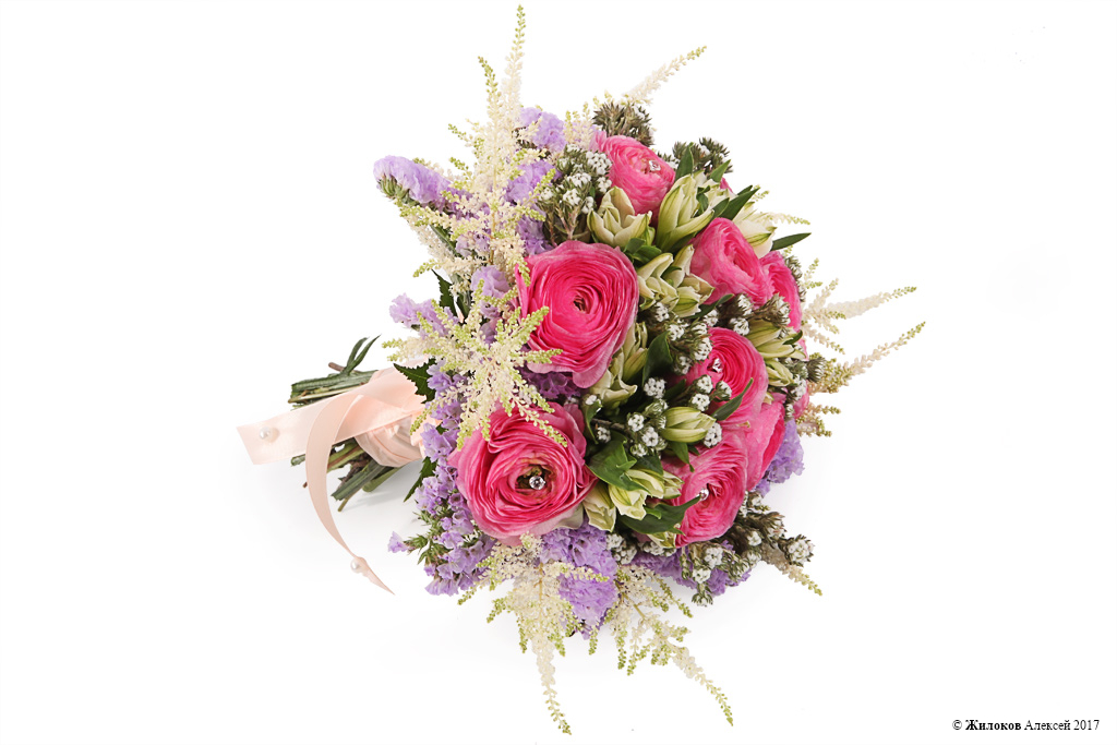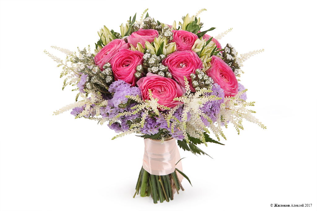 Состав: Ранункулюс - 10Альстромерия - 5 Астильба - 10 Статица - 1 Коттон Буш - 1 Атласная лента - 1 |