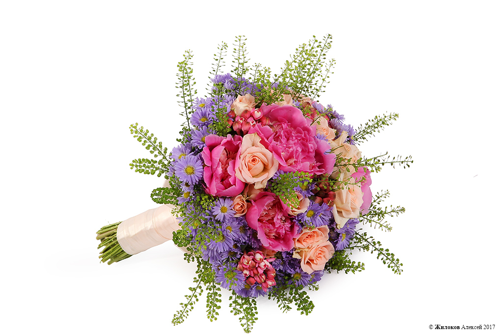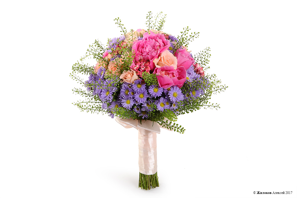 Очаровательный свадебный букет из персиковой кустовой розы и пионов в окружении нежно-фиолетовых звездчатых астр так и просится в руки невесты, чтобы сделать торжество еще прекраснее!