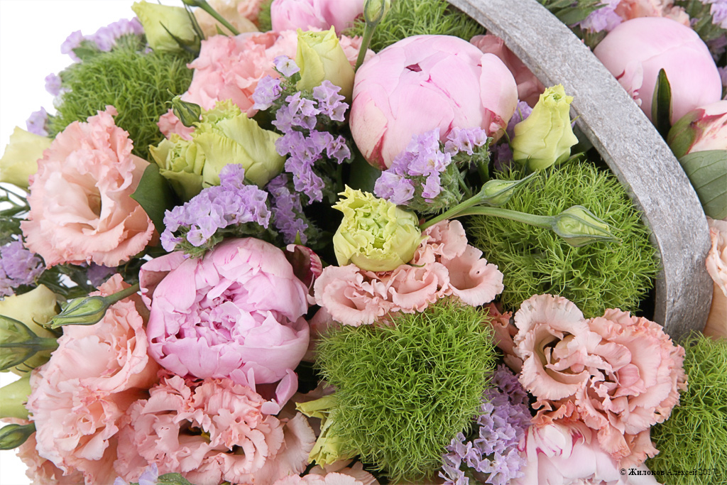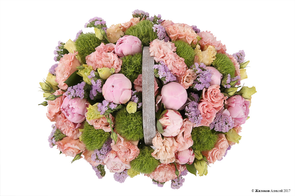 Состав: Пион - 10Эустома - 1 Статица - 1 Грин Трикс - 10 Рускус - 10 Корзина Basket stripes - 1 |