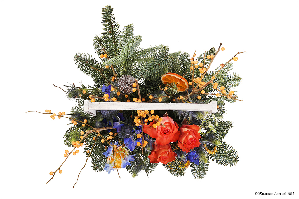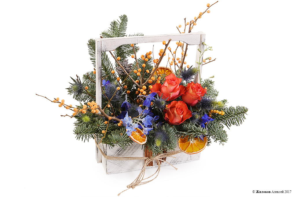Состав: Кашпо "Ящик с ручкой" - 1Илекс - 3 Нобилис - 3 Дельфиниум - 1 Эрингиум - 5 Роза одноголовая (Эквадор) - 3 Долька апельсина - 3 Украшение "Шишка" - 3 |