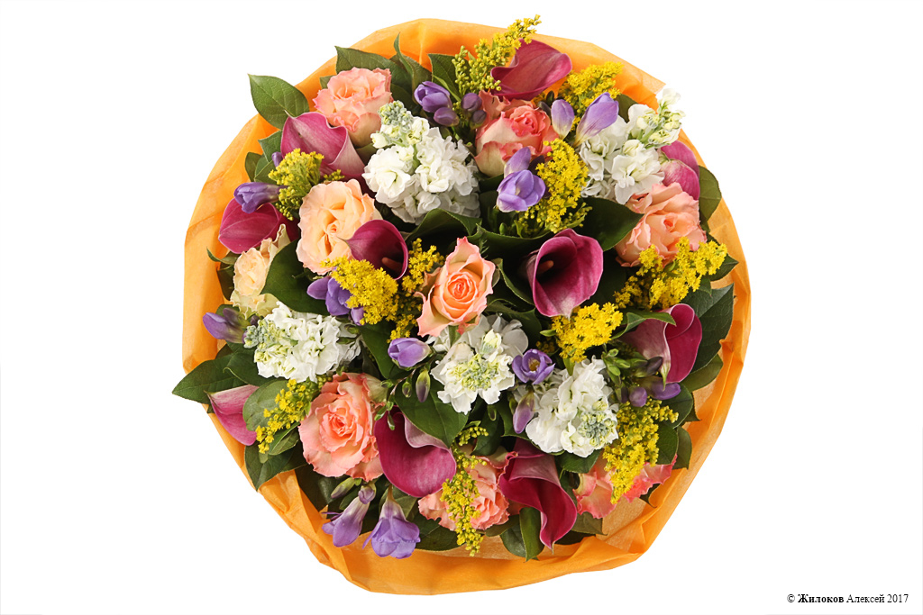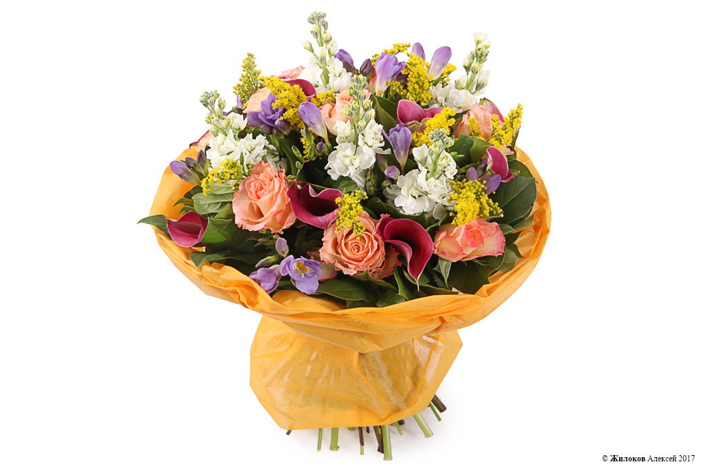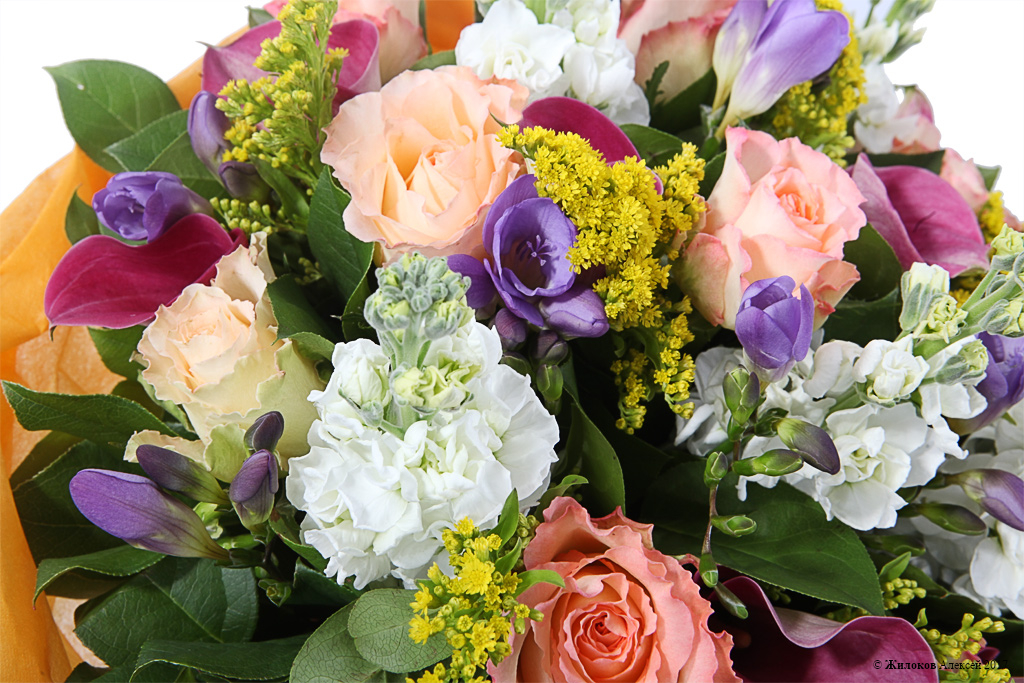 Состав: Роза одноголовая (Эквадор) - 10Калла - 10 Маттиола - 5 Фрезия - 10 Салал - 1 Солидаго - 10 Упаковка - фетр - 1 |