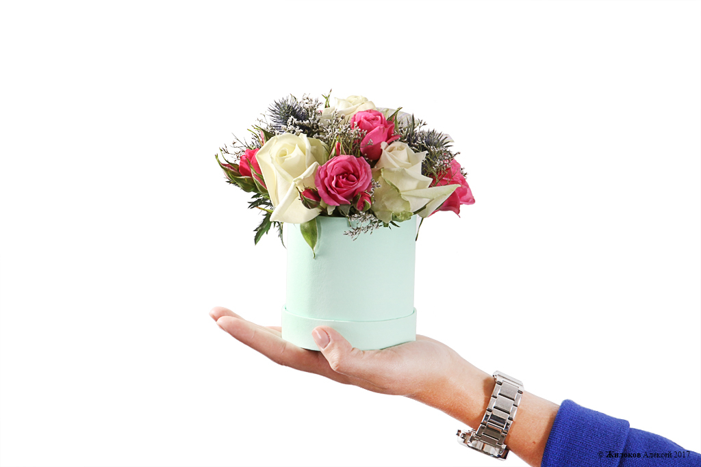 Состав: Роза Аваланш - 3Роза кустовая (Кения) - 1 Эрингиум - 1 Лимониум - 1 Коробка для цветов 9х9 (мини) - 1 |