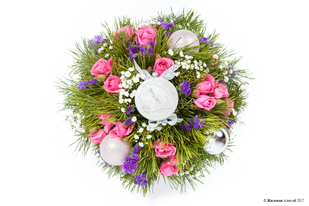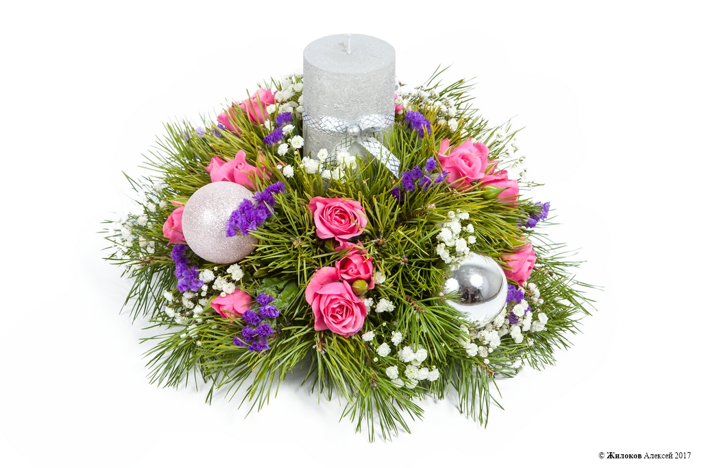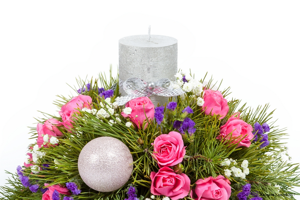 Описание: Ароматные сосновые веточки и нежные розы, вплетенные в праздничную композицию, соседствуют с елочными шарами и свечками, благодаря чему создается волшебная атмосфера Нового года.