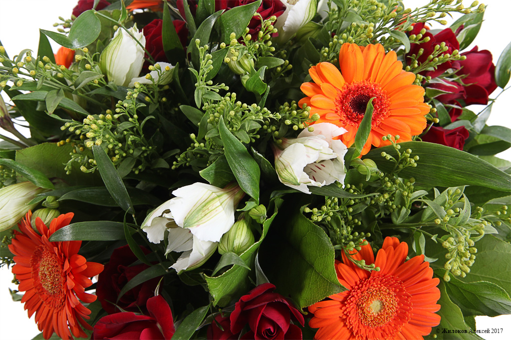 Яркий, гармоничный и выразительный, дарящий незабываемое тепло и радость, букет. Прекрасное сочетание роз и гербер насыщенного оранжевого цвета с воздушными альстромериями и сочной зеленью делает любой день настоящим праздником, а праздничный день оставляет в памяти на долгое время.