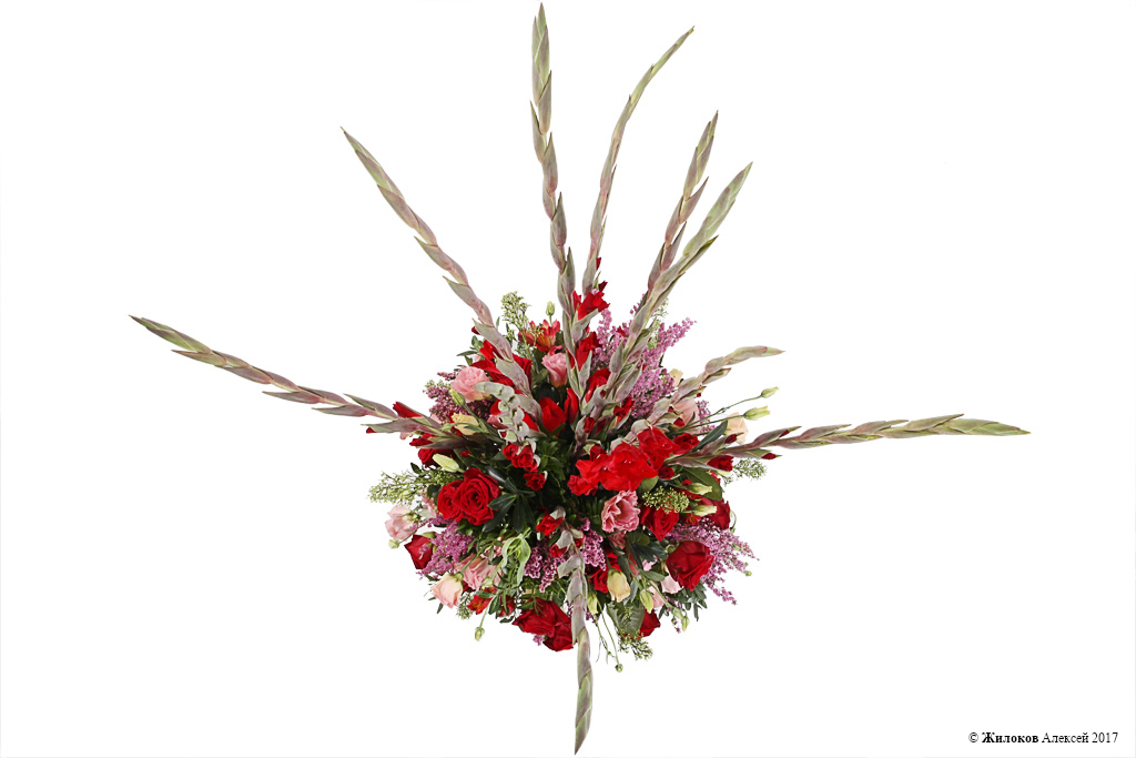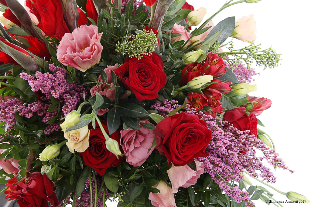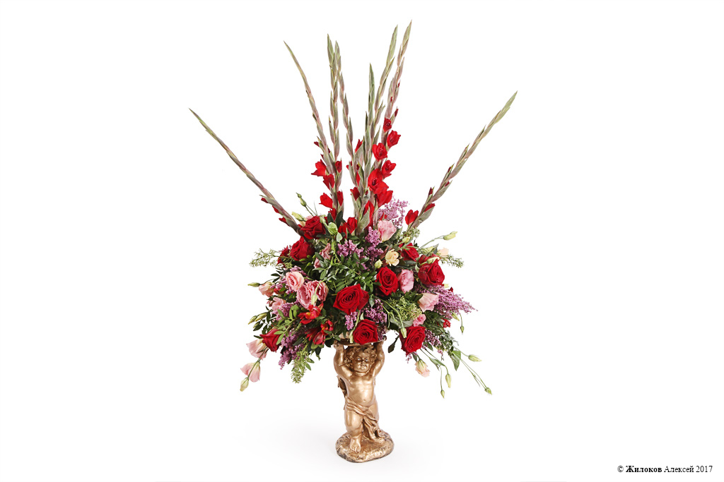 Описание: Чудесный цветочный подарок – композиция в розово-красных тонах, главные ноты в которой играют красные гладиолусы, розы и эустома. Изящная статуэтка-кашпо, которая держит цветы, добавляет облику композиции элегантности и тонкого очарования. |