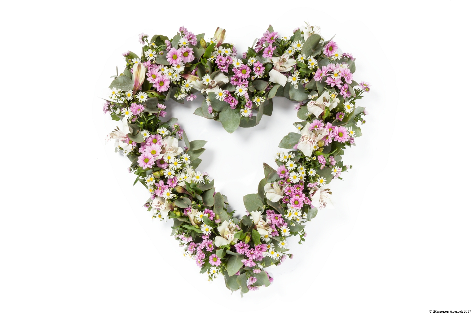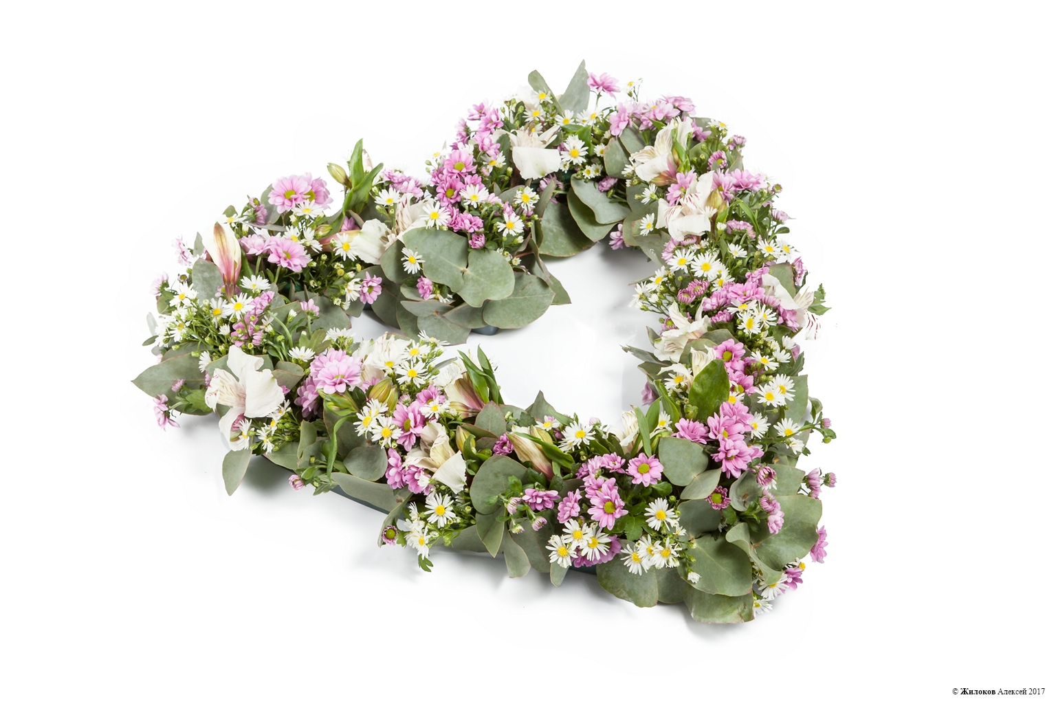 Это сердце на поддоне-оазисе выполнено из живых хризантем, астр и альстромерий, а за счет зелени эвкалипта оно выглядит удивительно нежно и утонченно.