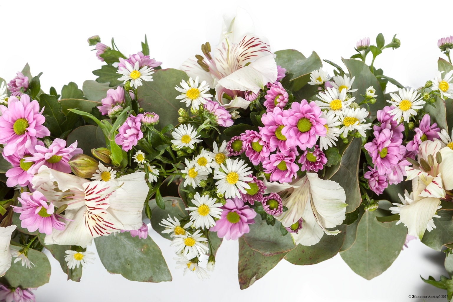 Состав: Хризантема Сантини - 20Эвкалипт - 1 Астра - 10 Альстромерия - 10 Оазис-сердце - 1 |